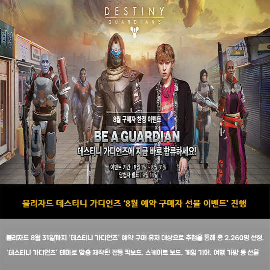 블리자드 8월 31일까지 '데스티니 가디언즈' 예약 구매 유저 대상으로 추첨을 통해 총 2,260명 선정, '데스티니 가디언즈' 테마로 맞춤 제작된 전동 킥보드, 스케이트 보드, 게임 기어, 여행 가방 등 선물
