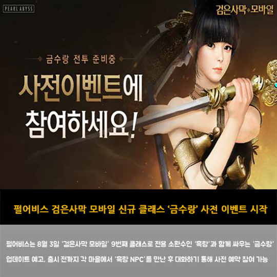 펄어비스는 8월 3일 '검은사막 모바일' 9번째 클래스로 전용 소환수인 '흑랑'과 함께 싸우는 '금수랑' 업데이트 예고, 출시 전까지 각 마을에서 '흑랑 NPC'를 만난 후 대화하기 통해 사전 예약 참여 가능
