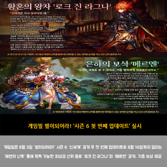 게임빌은 8월 3일 '별이되어라!' 시즌 6 '신세계' 공개 후 첫 번째 업데이트로 8월 16일까지 열리는 '해변의 난투' 통해 획득 가능한 최상급 신위 동료 '로크 진 라그나'와 '메르엔' 공개, 각종 보상 제공