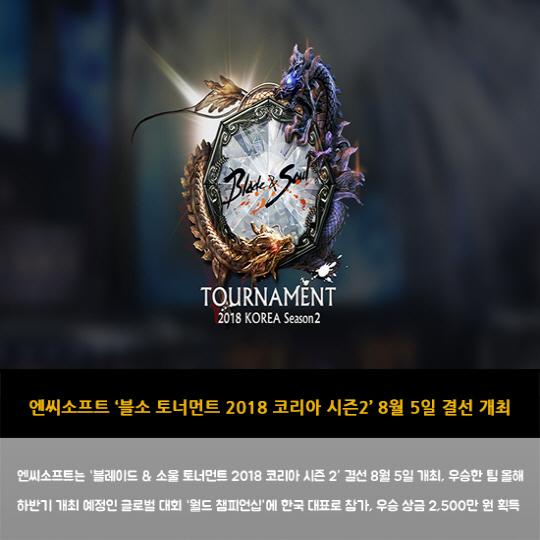엔씨소프트는 '블레이드 & 소울 토너먼트 2018 코리아 시즌 2' 결선 8월 5일 개최, 우승한 팀 올해 하반기 개최 예정인 글로벌 대회 '월드 챔피언십'에 한국 대표로 참가, 우승 상금 2,500만 원 획득