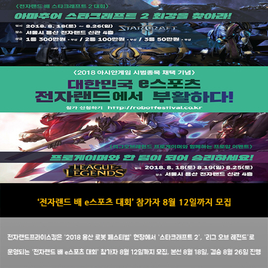 전자랜드프라이스킹은 '2018 용산 로봇 페스티벌' 현장에서 '스타크래프트 2', '리그 오브 레전드'로 운영되는 '전자랜드 배 e스포츠 대회' 참가자 8월 12일까지 모집, 본선 8월 18일, 결승 8월 26일 진행