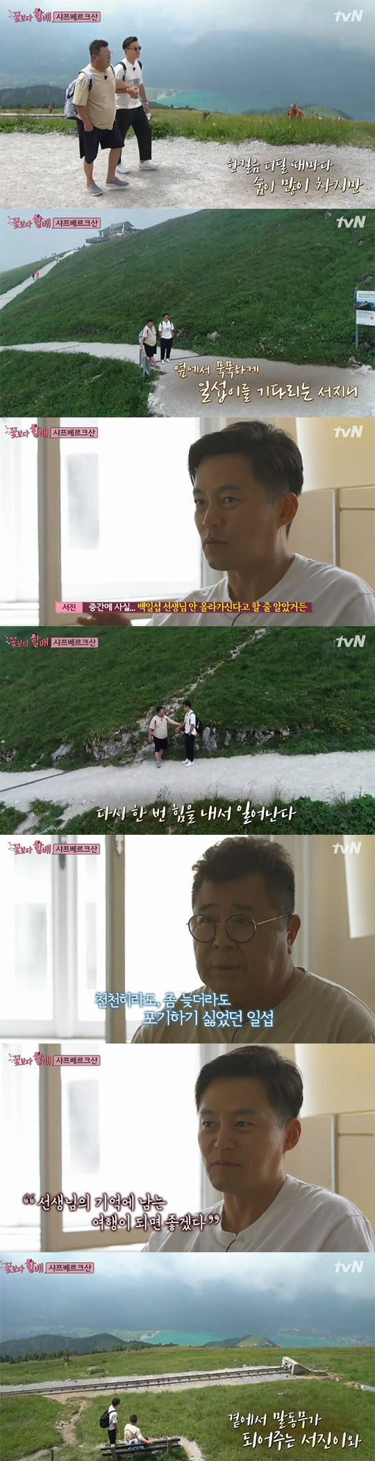 신구와 김용건은 보조를 맞추며 먼저 오른 반면, 다리가 불편한 백일섭은 좀처럼 오르지 못했다. 하지만 이서진이 백일섭을 부축하고 말동무가 되며 함께 올랐다.
