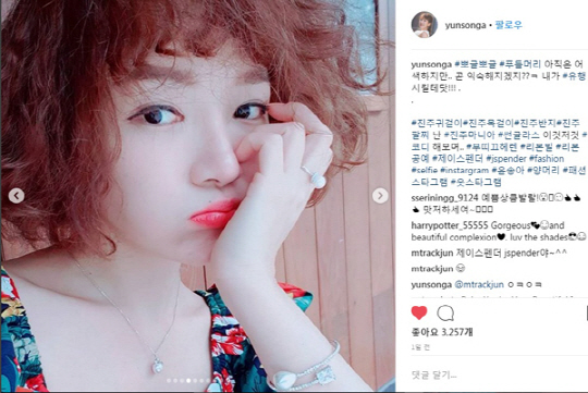 배우 윤송아가 자신의 SNS 계정에 "뽀글뽀글 푸들머리 아직은 어색 하지만…곧 익숙해 지겠지슌 ㅋ 내가 유행시킬테닷!!!' 이라는 게시글과 함께 다양한 표정과 포즈가 담긴 10장의 사진을 공개했다. 윤송아는 시원한 여름 분위기를 한껏 느낄 수 있고 특별한 액세서리 없어도 멋스러운 룩을 연출 할 수 있는 플라워 패턴을 착용했다.