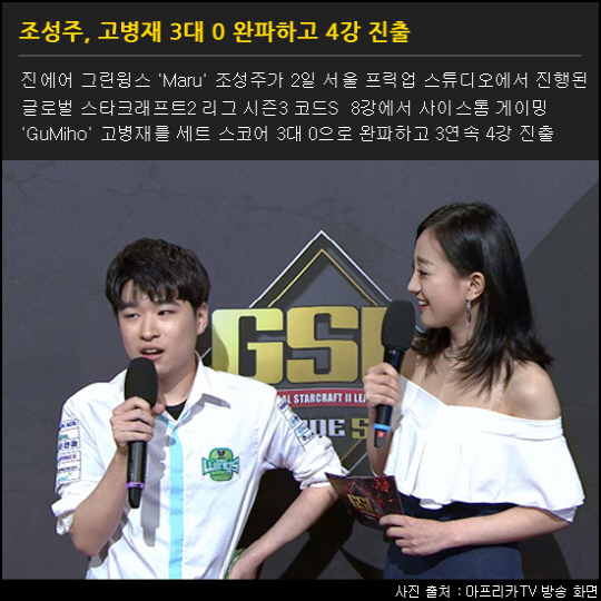진에어 그린윙스 'Maru' 조성주가 2일 서울 프릭업 스튜디오에서 진행된 글로벌 스타크래프트2 리그 시즌3 코드S 8강에서 사이스톰 게이밍 'GuMiho' 고병재를 세트 스코어 3대 0으로 완파하고 3연속 4강 진출