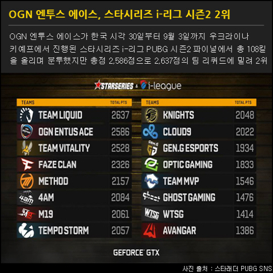 OGN 엔투스 에이스가 한국 시각 30일부터 9월 3일까지 우크라이나 키예프에서 진행된 스타시리즈 i-리그 PUBG 시즌2 파이널에서 총 108킬을 올리며 분투했지만 총점 2,586점으로 2,637점의 팀 리퀴드에 밀려 2위