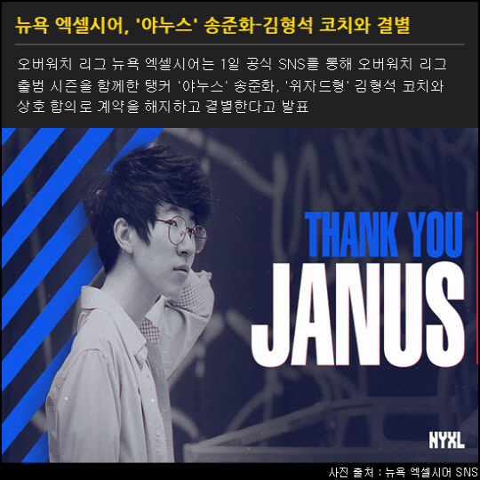 오버워치 리그 뉴욕 엑셀시어는 1일 공식 SNS를 통해 오버워치 리그 출범 시즌을 함께한 탱커 '야누스' 송준화, '위자드형' 김형석 코치와 상호 합의로 계약을 해지하고 결별한다고 발표