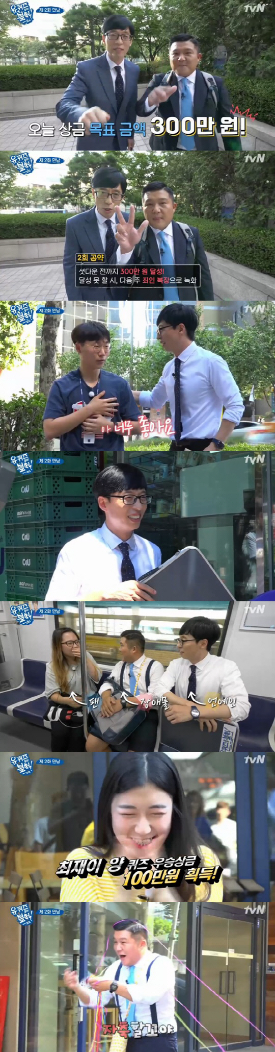 막간을 이용해 식사를 마친 유재석과 조세호는 지하철에 몸을 실고 성수동으로 향했다. 그리고 역에서 마주친 한 소녀와 퀴즈를 진행했고, 다섯 문제를 다 맞춘 소녀는 상금의 주인공이 됐다. 특히 상금을 가족들에게 쓰겠다고 말해 훈훈함을 자아냈다.