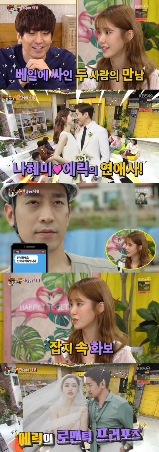 나혜미는 "멀리 해변가 모래사장에 꽃다발을 들고 서 있는 에릭이 나를 기다리고 있는 모습을 보니까 안쓰럽기도 하고 미안하기도 했다"고 평생 기억에 남을 프러포즈의 순간을 털어놨다.