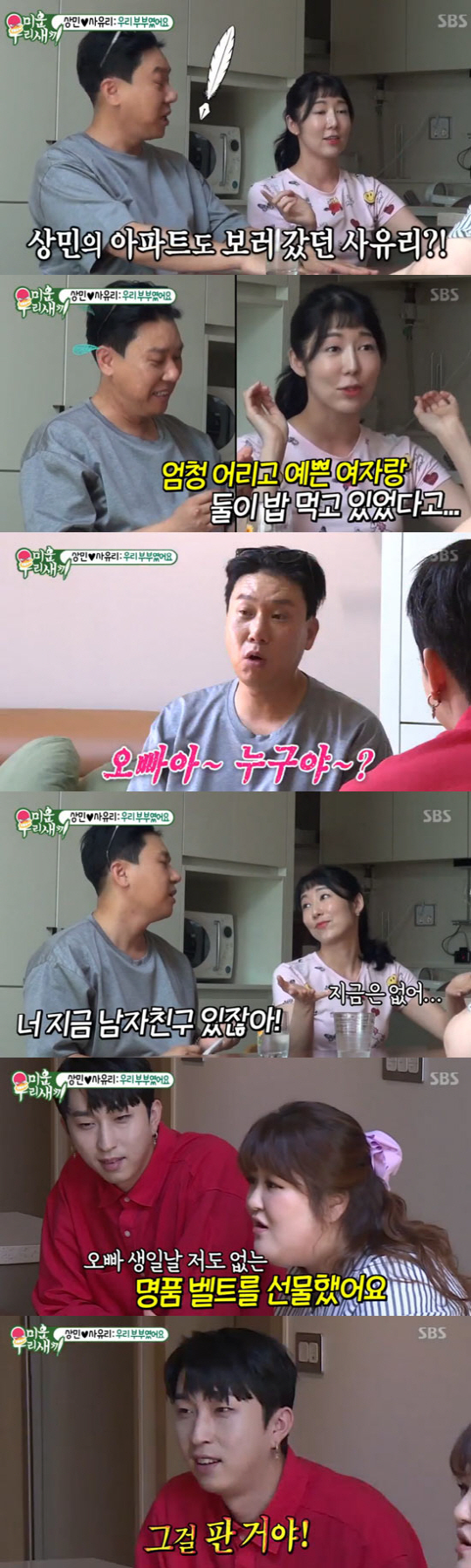 이상민은 "이 아파트가 싱글남들이 많이 사는 곳이다. 김종국 김종민도 산다. 일부러 이사온 것이냐"라고 물었다. 사유리는 "이웃이라고 들었는데 한번도 만나지 못했다. 사실 이상민 오빠 사는 아파트도 집을 보러 갔었다. 하지만 혹시라도 오빠가 연애할 때 같이 엘리베이터에서 만나면 얼마나 난감하겠나. 오빠는 저를 아는 척 안할 것"이라고 말했다. 이어 "예전에 오빠와 가상 부부할 때는 어떤 소문도 안돌았는데 요즘 소문이 들린다. 아주 어리고 예쁜 여자와 밥먹고 있는 걸 동물병원 선생님이 보시고 말해주셨다. 누구냐"라고 돌직구로 물었다. 이상민은 "만약 내가 연애한다면 기사가 나기 전에 사유리에게 말할 것"이라며 "그런데 사유리 너 남자친구 있잖아"라고 공격했다. 사유리는 "지금은 없다"고 말해 웃음을 유발했다.