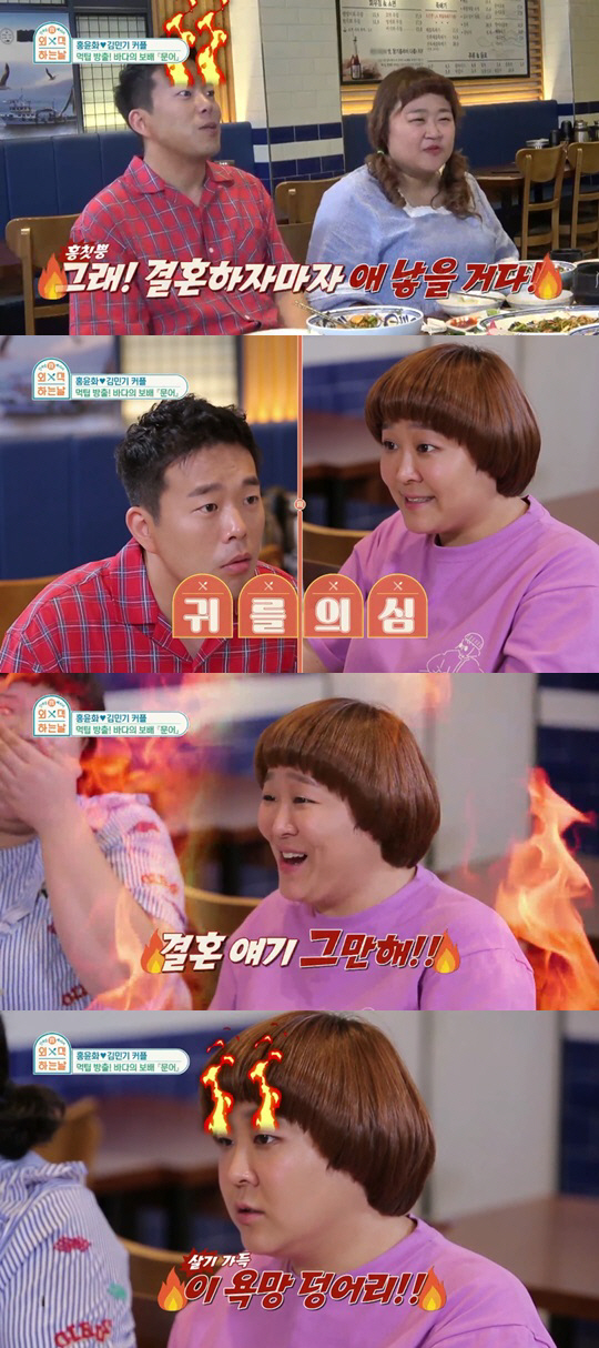 이날 네 사람은 1인 1족발 클리어 후 꼬막과 문어 맛집 정복에 나섰다. 무아지경 먹방을 즐기던 홍윤화는 문어를 손수 김민기에게 먹여주며 꽁냥 커플의 애정을 과시했다. 이에 기분이 좋아진 김민기가 뽀뽀를 요구하자 윤효동은 "이 욕망 덩어리"라며 일침을 날리기도 했다. 김민기는 지지 않고 "그래, 결혼하자마자 애 낳을거다!"라고 티격태격 하는 모습으로 폭소를 유발했다.