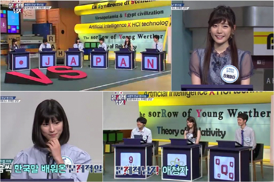 이날 방송에서는 대결 상대가 누구인지 파악하게 된 문제적 남자들의 반응이 웃음을 선사할 전망. 한국과 일본 양국의 대형국기를 내걸고 진행되는 대결에 출연자들은 극심한 부담감을 호소하며 불안한 표정을 지어 폭소를 안긴다. '한일 뇌섹대결'에 참가하는 일본 뇌섹남녀는 총 6명으로, 상상을 초월하는 스펙과 뇌섹 매력으로 이목을 사로잡을 예정이다. 일본 일류대 출신은 기본, 실제 일본 퀴즈 프로그램에서 활약하고 있는 출연자를 비롯해 지성과 미모를 겸비한 출연자까지, 일본 대표 뇌섹남녀들은 학창시절의 남다른 공부법과 독특한 취향을 공개해 놀라움을 안긴다.