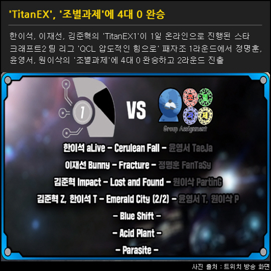 한이석, 이재선, 김준혁의 'TitanEX1'이 1일 온라인으로 진행된 스타크래프트2 팀 리그 'QCL 압도적인 힘으로' 패자조 1라운드에서 정명훈, 윤영서, 원이삭의 '조별과제'에 4대 0 완승하고 2라운드 진출