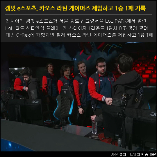 러시아의 갬빗 e스포츠가 서울 종로구 그랑서울 LoL PARK에서 열린 LoL 월드 챔피언십 플레이-인 스테이지 1라운드 1일차 D조 경기 결과 대만 G-Rex에 패했지만 칠레 카오스 라틴 게이머즈를 제압하고 1승 1패