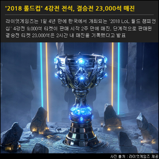 라이엇게임즈는 1일 4년 만에 한국에서 개최되는 '2018 LoL 월드 챔피언십' 4강전 9,000석 티켓이 판매 시작 2주 만에 매진, 단계적으로 판매된 결승전 티켓 23,000석은 2시간 내 매진을 기록했다고 발표