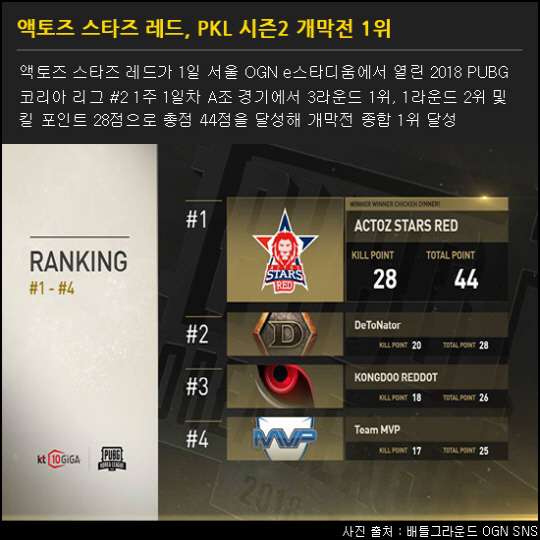액토즈 스타즈 레드가 1일 서울 OGN e스타디움에서 열린 2018 PUBG 코리아 리그 #2 1주 1일차 A조 경기에서 3라운드 1위, 1라운드 2위 및 킬 포인트 28점으로 총점 44점을 달성해 개막전 종합 1위 달성