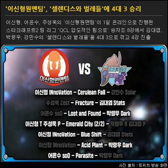 이신형, 어윤수, 주성욱의 '이신형원맨팀'이 1일 온라인으로 진행된 스타크래프트2 팀 리그 'QCL 압도적인 힘으로' 승자조 8강에서 김대엽, 박령우, 강민수의 '셀렌디스와 벌레들'을 4대 3으로 꺾고 4강 진출