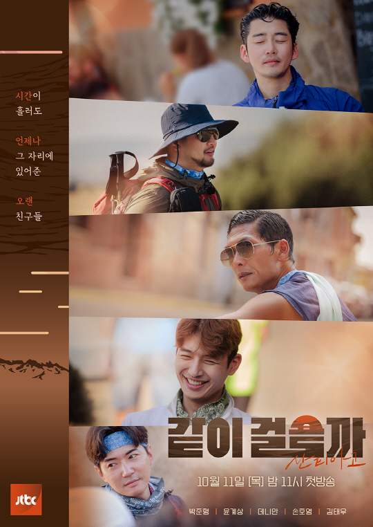 11일(목) 밤 11시에 첫 방송 되는 JTBC 신규 예능 프로그램 '같이 걸을까'(연출 오윤환 정승일)는 '친구와 함께하는 트래킹 여행'을 표방하는 리얼리티 예능 프로그램이다. 20년 지기 god 멤버 박준형, 윤계상, 데니안, 손호영, 김태우 5인이 스페인 산티아고 순례길을 걷고 숙박하며 생기는 일상을 담는다.