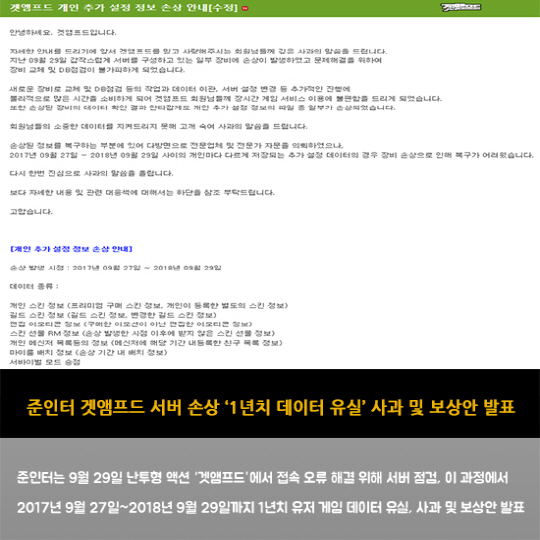 - 준인터 겟앰프드 서버 손상 '1년치 데이터 유실' 사과 및 보상안 발표