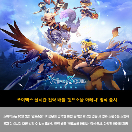 조이맥스는 10월 2일 '윈드소울' IP 활용해 강력한 마법 능력을 보유한 영웅 세 명과 소환수를 조합해 유저 간 실시간 대전 벌일 수 있는 모바일 전략 배틀 '윈드소울 아레나' 정식 출시, 다양한 아이템 제공