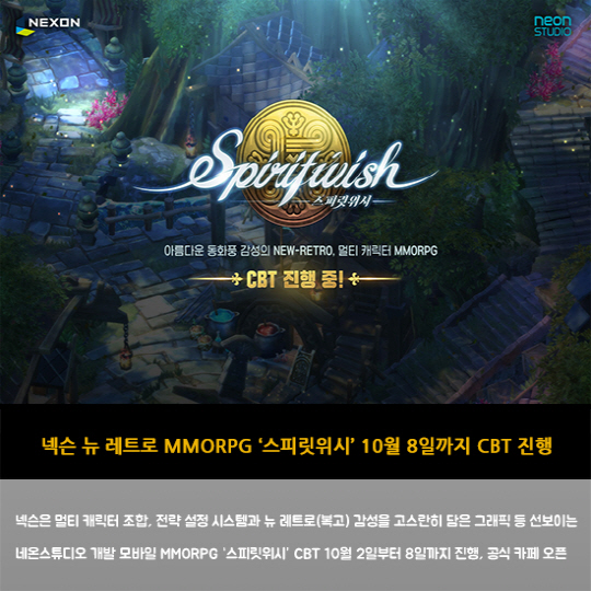 넥슨은 멀티 캐릭터 조합, 전략 설정 시스템과 뉴 레트로(복고) 감성을 고스란히 담은 그래픽 등 선보이는 네온스튜디오 개발 모바일 MMORPG '스피릿위시' CBT 10월 2일부터 8일까지 진행, 공식 카페 오픈