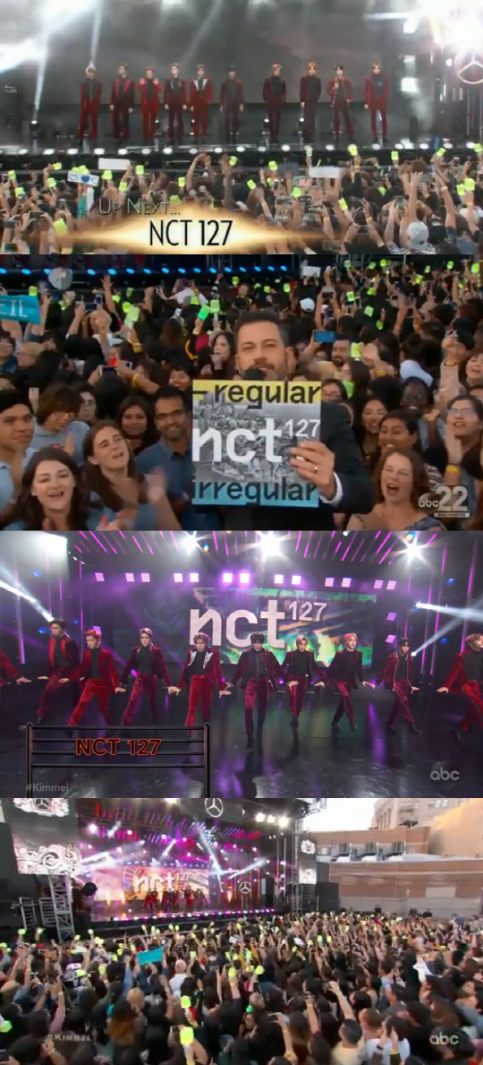NCT 127은 8일 오후 11시 35분(미국 동부 시간) 지상파 방송 ABC를 통해 방송된 '지미 키멜 라이브'에 뮤직 게스트로 출연해 오는 12일 발표를 앞둔 첫 정규 앨범 타이틀 곡 'Regular'(레귤러)를 화려한 퍼포먼스와 함께 선사, 성공적인 미국 데뷔 무대를 펼쳐 현지 시청자들의 눈과 귀를 사로잡았다.