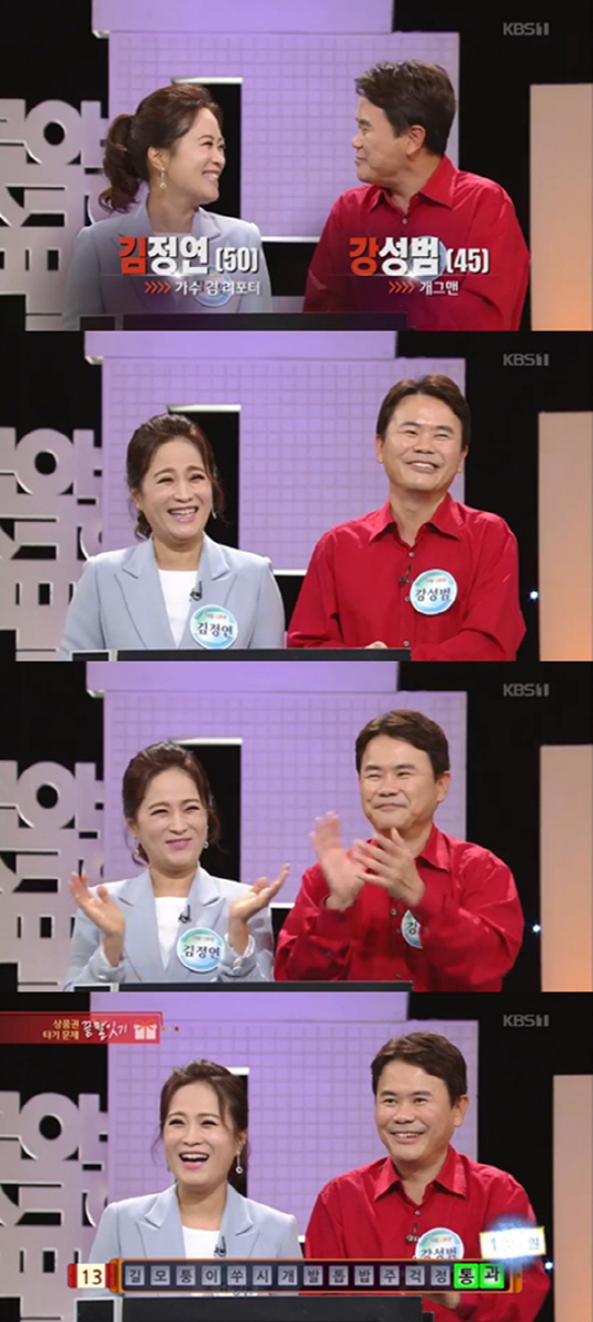 8일 오후 제572돌 한글날을 맞아 '한글날 특집'으로 방송된 KBS 1TV '우리말 겨루기'(프로듀서 방성용)에 가수 겸 MC 김정연이 개그맨 강성범과 팀을 이뤄 우리말 달인에 도전한 것.