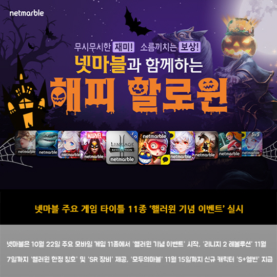 넷마블은 10월 22일 주요 모바일 게임 11종에서 '핼러윈 기념 이벤트' 시작, '리니지 2 레볼루션' 11월 7일까지 '핼러윈 한정 칭호' 및 'SR 장비' 제공, '모두의마블' 11월 15일까지 신규 캐릭터 'S+엘빈' 지급