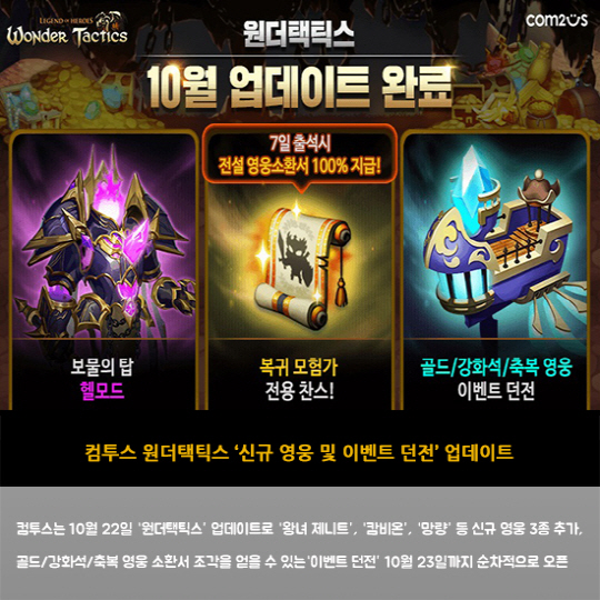 컴투스는 10월 22일 '원더택틱스' 업데이트로 '왕녀 제니트', '캄비온', '망량' 등 신규 영웅 3종 추가, 골드/강화석/축복 영웅 소환서 조각을 얻을 수 있는'이벤트 던전' 10월 23일까지 순차적으로 오픈