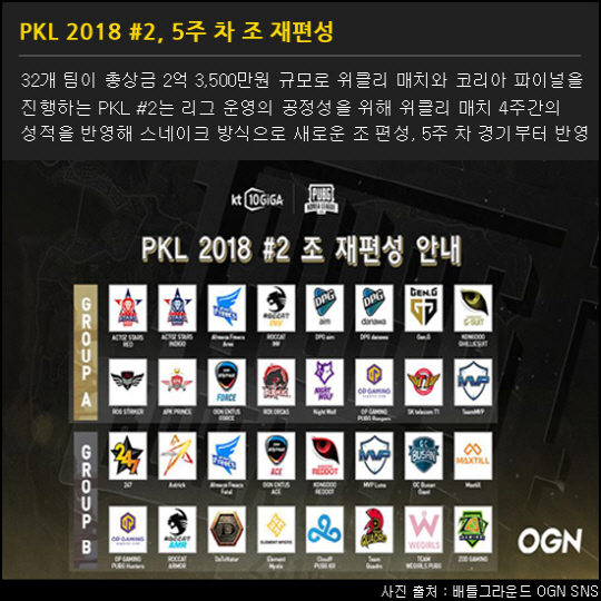 32개 팀이 총상금 2억 3,500만원 규모로 위클리 매치와 코리아 파이널을 진행하는 PKL #2는 리그 운영의 공정성을 위해 위클리 매치 4주간의 성적을 반영해 스네이크 방식으로 새로운 조 편성, 5주 차 경기부터 반영