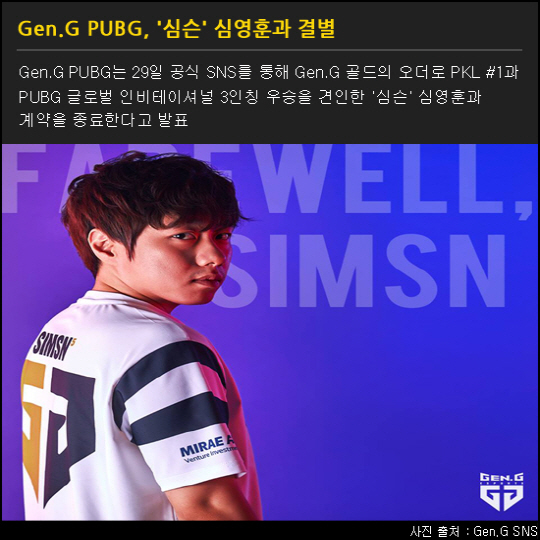 Gen.G PUBG는 29일 공식 SNS를 통해 Gen.G 골드의 오더로 PKL #1과 PUBG 글로벌 인비테이셔널 3인칭 우승을 견인한 '심슨' 심영훈과 계약을 종료한다고 발표