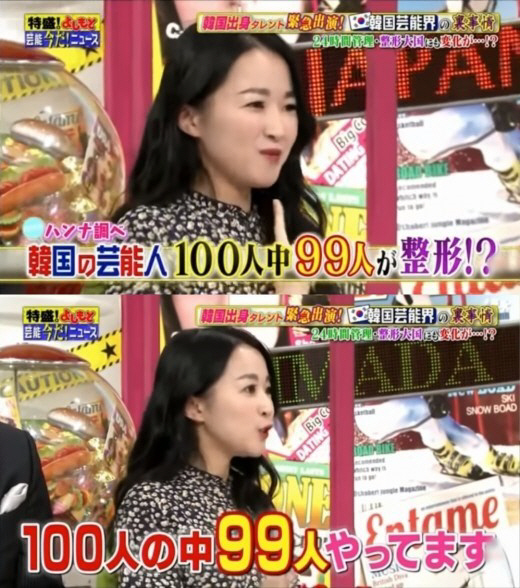문제의 방송인의 이름은 강한나다. 문제의 발언은 지난 27일 그가 출연했던 일본 요미우리TV 예능 프로그램 '도쿠모리 요시모토'에서 나왔다. 강한나는 해당 방송에서 "한국 연예인 100명 중 99명이 성형을 한다. 연예인 친구들을 만나면 매번 얼굴이 바뀌는데 성형 사실을 알리지 않는다. 가만히 보고 있으면 부끄러워한다. 연예인 말고 일반인들도 성형을 많이 한다"고 말하며 자신도 성형에 대한 권유를 받은 바 있지만, 성형을 하지 않았다고 주장했다.