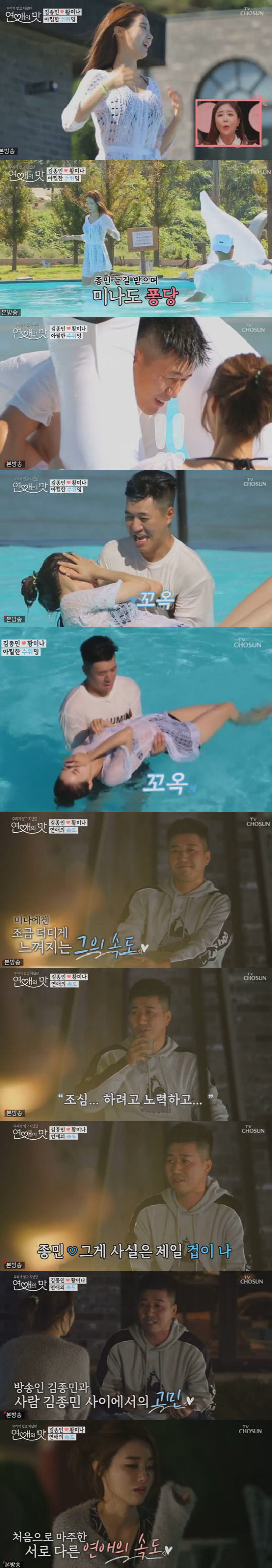 김종민은 "어느 선까지는 빨리 가는데 어느 선부터는 되게 더디다. 사실 (진지한 관계가 되면) 나만 힘들면 상관없는데 상대가 힘들까봐 걱정이 된다"고 운을 뗐다. 그는 "방송에서의 김종민과 실제 김종민의 차이가 있을 건데 진짜 내 모습을 보였을 때 너가 실망할까봐 겁이 난다"고 솔직하게 말했다. 그래서 김종민은 황미나와 서로 조금씩 천천히 알아가고 싶었던 것.