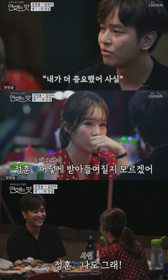 김정훈은 "예전에 만났던 여자분들이 나에게 차갑다고 했다. 그래서 나에게 맞춰주는 여자를 만났던 것 같다. 이제 변해보려고 한다. 그런데 내 노력이 어떻게 받아들여질지 모르겠다"며 "너와 나이 차이가 나는 것도 좀 미안하다"고 말했다. 김진아는 "난 안 불편한데 오빠는 나이 차이가 불편하냐?"라며 물었고, 김정훈은 "사실 나도 그래(안 불편해)"라며 활짝 웃었다.