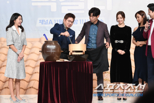 출연진은 기자간담회에 앞서 막걸리를 직접 내리는 시연을 했다. 포토타임부터 남달랐다. 막걸리 잔을 들고 촬영에 임했고 이종혁은 실제로 '원샷'을 하는 등 '지붕 위의 막걸리'만의 분위기가 묻어났다.