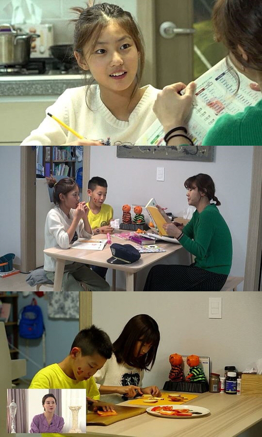 엄마 박연수와 함께 영어공부를 하는 송지아-지욱 남매. 박연수는 "습관을 들이기 위해 하루에 영어단어 5개씩은 꼭 외우게 한다"며 아이들에 대한 교육 철학을 밝혔다.