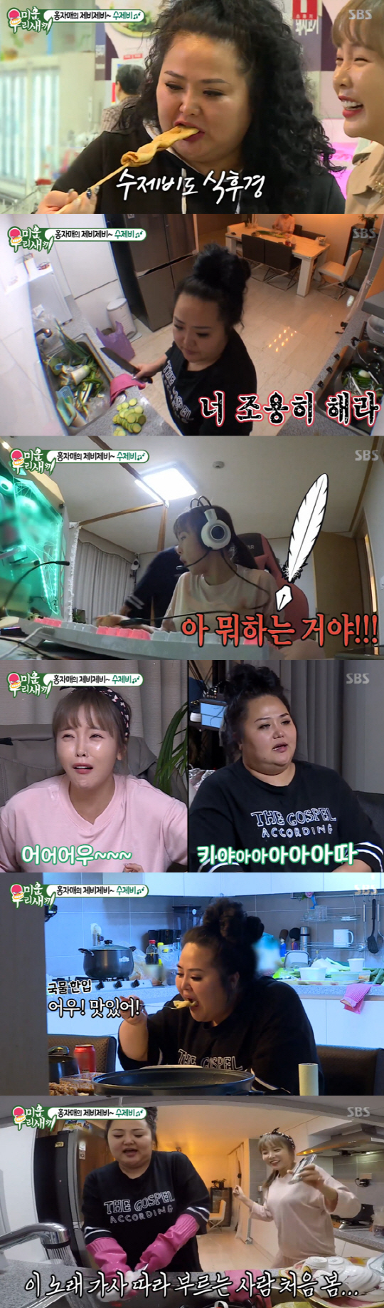 수제비 반죽을 한 뒤 육수가 끓는 동안 홍자매는 TV 속 먹방에 제대로 빠져들었다. 특히 언니는 식품 홈쇼핑을 보던 중 모델의 표정을 보고 100% 확신, '매진임박'이 뜨자 바로 결제해 웃음을 안겼다.