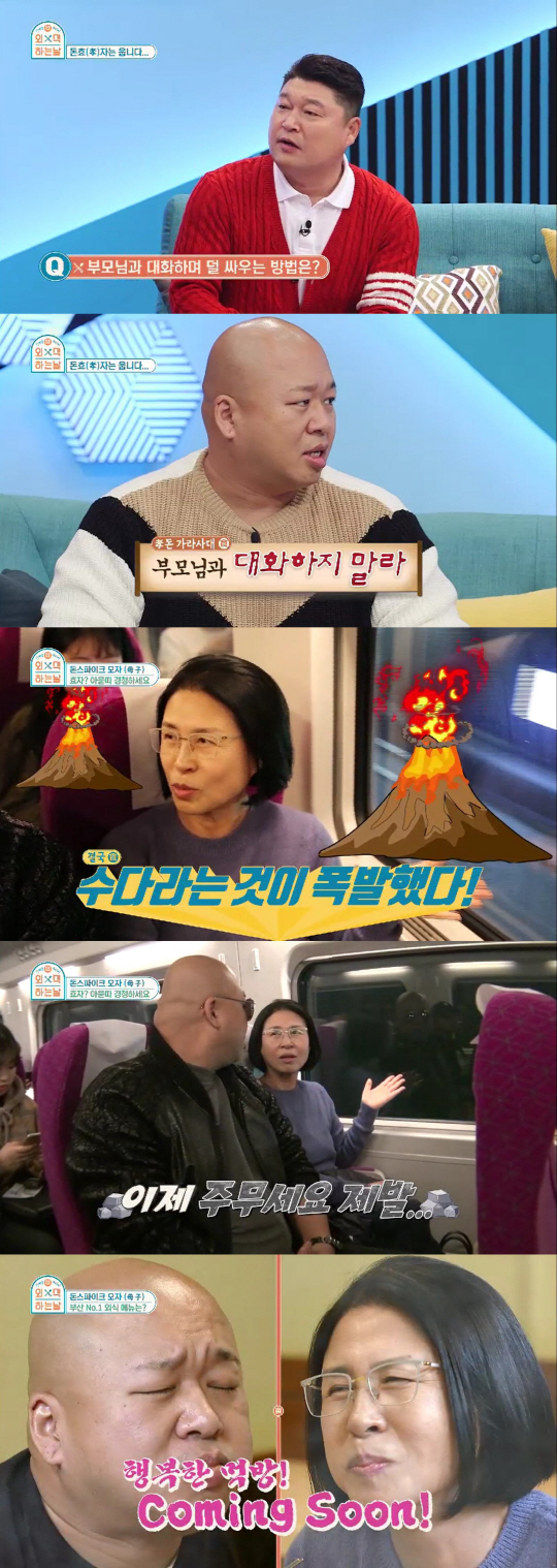 돈스파이크 모자는 세 번째 효도 외식에 나선다. 돈스파이크는 고속열차를 한 번도 안 타봤다는 신봉희 여사를 위해 SRT 여행을 준비한다. '기차 타고 부산 가기'라는 소원을 이루게 된 신봉희 여사는 돈스파이크에게 연신 말을 건네며 들뜬 마음을 감추지 못했다. 한편 신봉희 여사의 끊임없는 수다를 경청하던 돈스파이크는 나지막히 주무실 것을 제안, 스튜디오를 웃음바다로 만들었다.