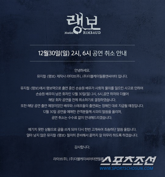 뮤지컬 '랭보' 측은 금일 공식 보도자료를 통해 "손승원 배우의 남은 회차인 30일 2시, 6시 공연 하차와 더불어 해당 회차 공연을 취소하기로 결정했다"고 전했다. 이어 "해당 공연을 예매한 관객들은 취소 수수료 없이 전액 환불을 진행하고, 배우들과 스태프들의 출연료는 정해진대로 지급될 예정"이라고 설명했다.