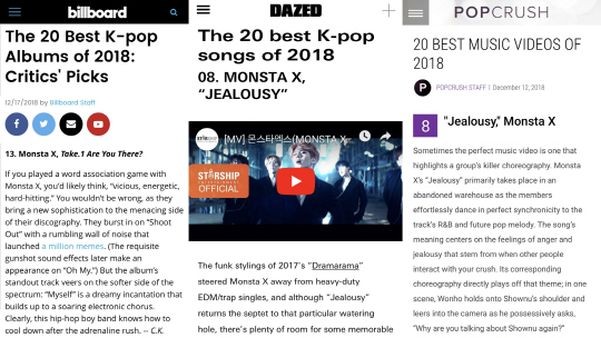 미국의 '팝크러시'는 K팝 영역이 아니라 팝 전체의 영역에서 몬스타엑스의 선전을 기념했다. '팝크러시'는 최근 공개한 '2018 베스트 뮤직비디오 20'에 몬스타엑스의 'Jealousy' 뮤직비디오를 랭크시키며 높은 점수를 부여했다. 매체는 "몬스타엑스가 간과할 수 없는 그룹이라는 것을 증명하는 최고의 뮤직비디오"라며 극찬을 아끼지 않았다.