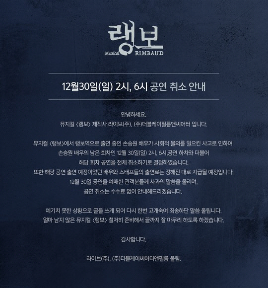 제작사 측은 26일 '랭보' 역으로 출연 중인 배우 손승원의 남은 회차 공연을 아예 취소하기로 했다고 공식 입장을 밝혔다. 손승원은 군 입대를 앞두고 '랭보' 마지막 공연으로 오는 30일 (일) 2시, 6시 총 2회차를 남겨 둔 상황이었다.