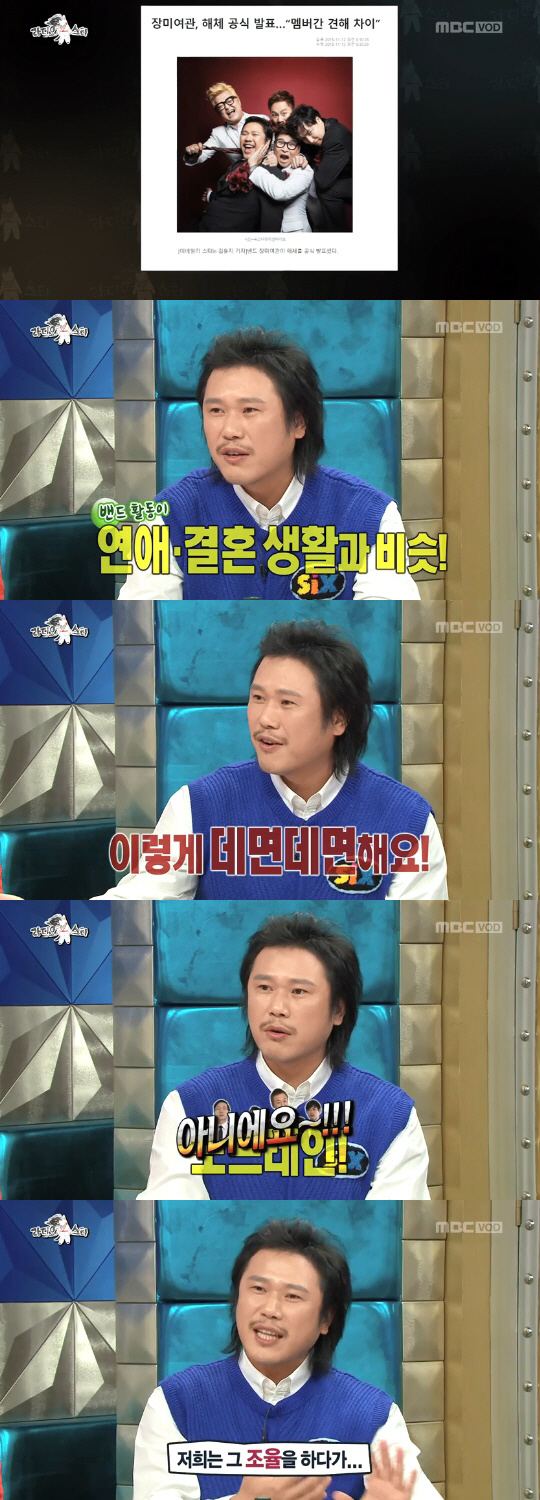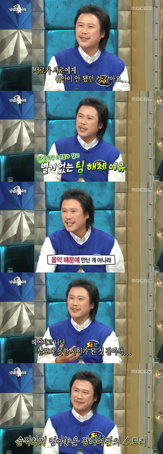 육중완 밴드로 활동 중인 육중완은 이날 장미여관 해체 후 심경에 대해 "밴드 활동은 연애나 결혼 생활과 비슷하다. 처음에는 좋고 행복하다가 사소한 거를 맞추지 못해 싸운다. 그다음에는 대화가 없어지고 이혼까지 가게 되는 거 같다"고 털어놨다.