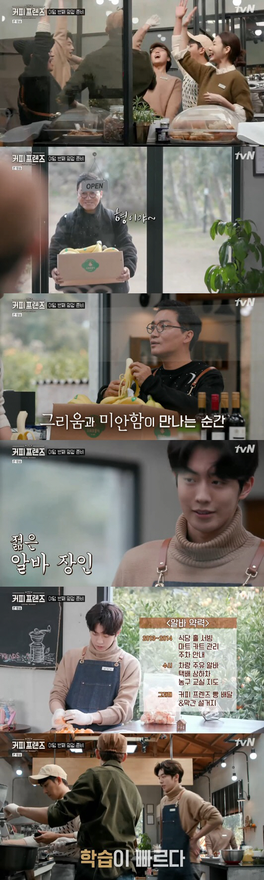 그리고 '커피프렌즈'즈 마지막 영업일의 아침이 밝혔다. 유연석과 손호준은 평소와는 다른 마음가짐으로 출근해 재료 손질에 들어갔다. 특히 이날 조재윤이 다시 카페를 찾아와 반가움을 안겼다. 조재윤은 아침을 안 먹었을 멤버들을 위해 바나나까지 사와 훈훈함을 자아냈다.