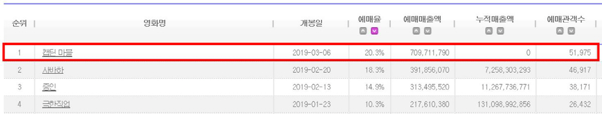 개봉을 무려 10일을 앞둔 오늘 '캡틴 마블'이 영화진흥위원회 통합전산망 기준 이정재 주연 '사바하', 장기 흥행 중인 '극한직업' 및 '증인' 등 모든 작품들을 제치고 전체 예매율 1위에 등극하는 놀라운 행보를 보여주고 있다.