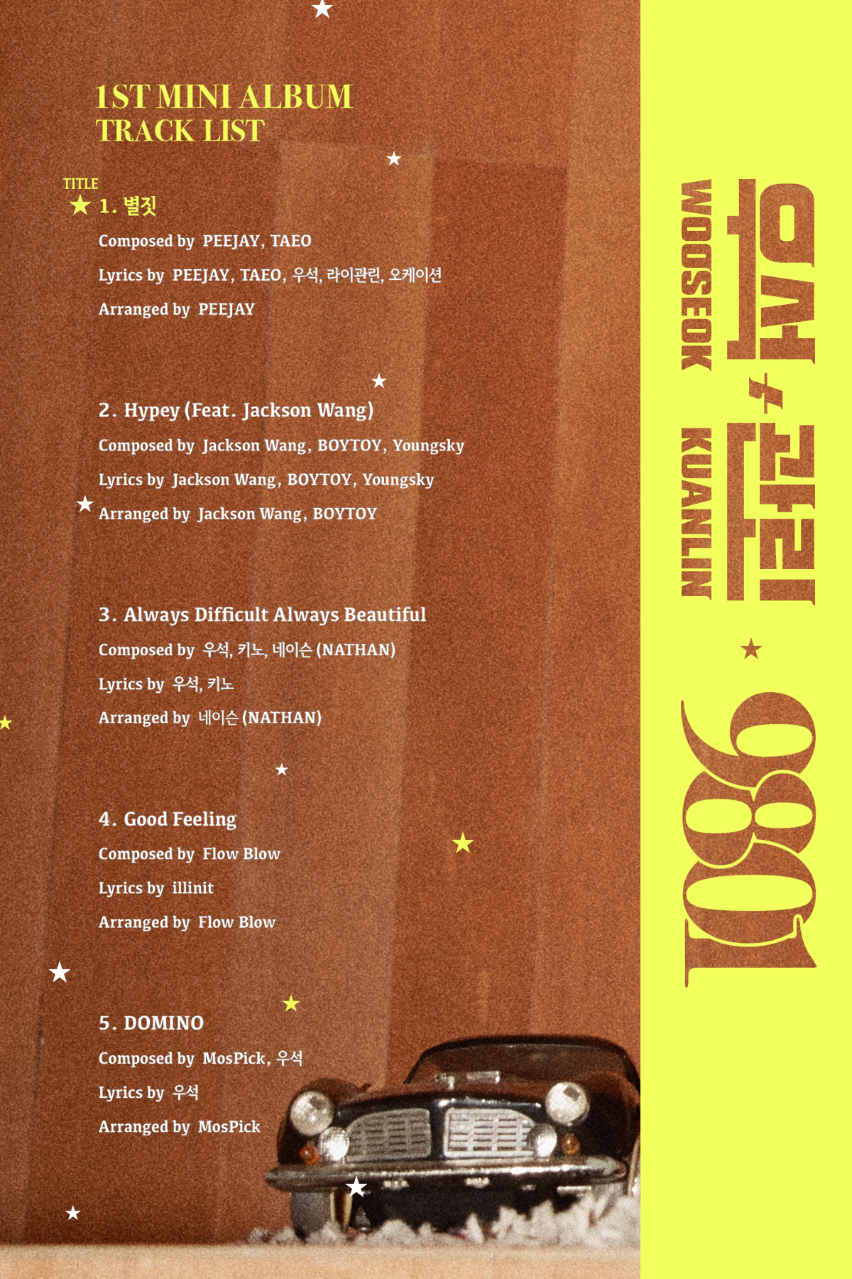 공개된 트랙리스트에는 타이틀곡 '별짓'를 비롯해 'Hypey(Feat. Jackson Wang)', 'Always Difficult Always Beautiful', 'Good Feeling', 'DOMINO'까지 총 다섯 곡의 리스트가 담겨있다.