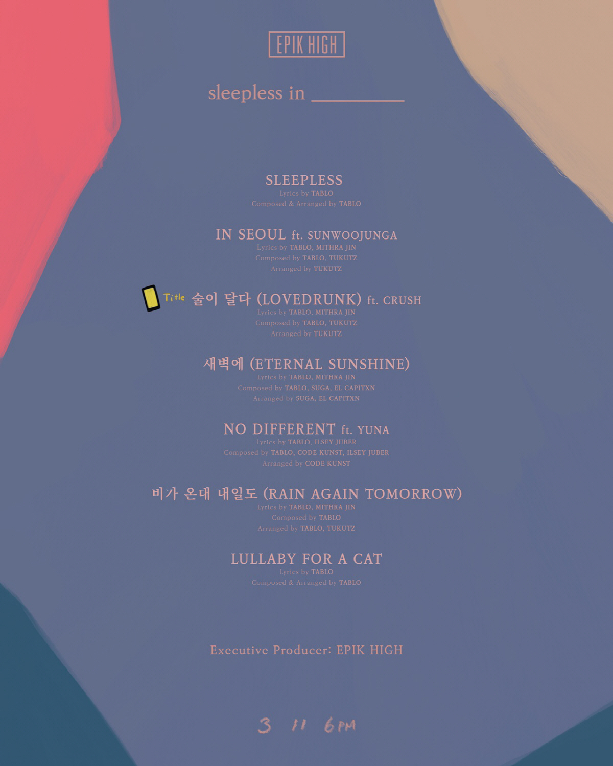 에픽하이(타블로, 미쓰라, 투컷)는 5일 0시 공식 SNS 채널들을 통해 오는 11일 발매 예정인 새 앨범 'sleepless in __________' 트랙리스트 이미지를 공개했다.