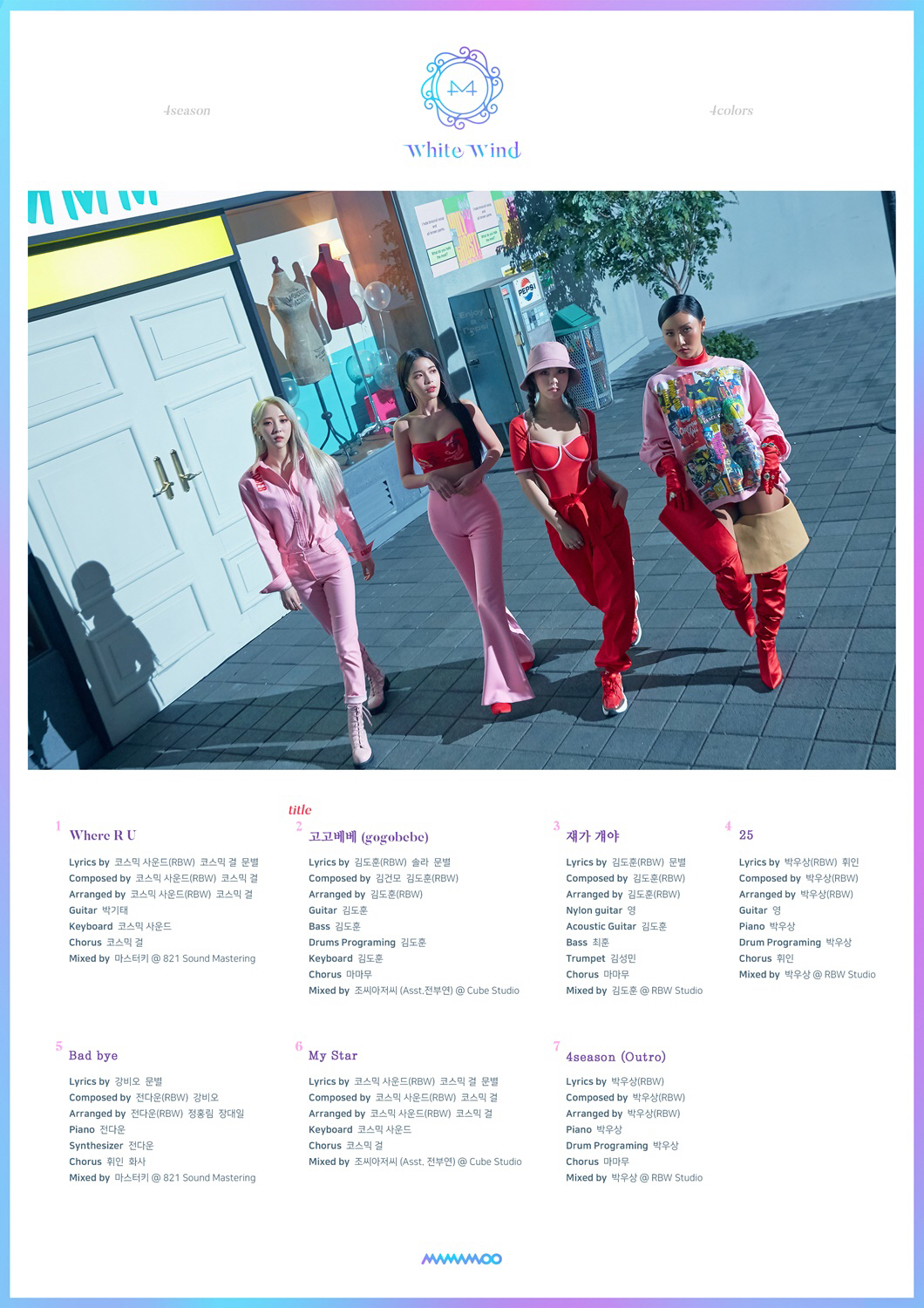 또한, 트랙리스트에 따르면 이번 앨범에는 타이틀곡 '고고베베(gogobebe)'를 비롯해 운명적인 연인을 기다리는 설레는 마음을 표현한 'Where R U', 봄을 닮은 러브송 '쟤가 걔야', 휘인이 작사에 참여한 '25', 가슴 아픈 이별을 노래한 'Bad bye', 부드러우면서도 달콤한 고백송 'My Star', '포시즌 포컬러 프로젝트'의 대미를 장식하는 아웃트로 '4season'까지 총 7곡이 포함됐다.