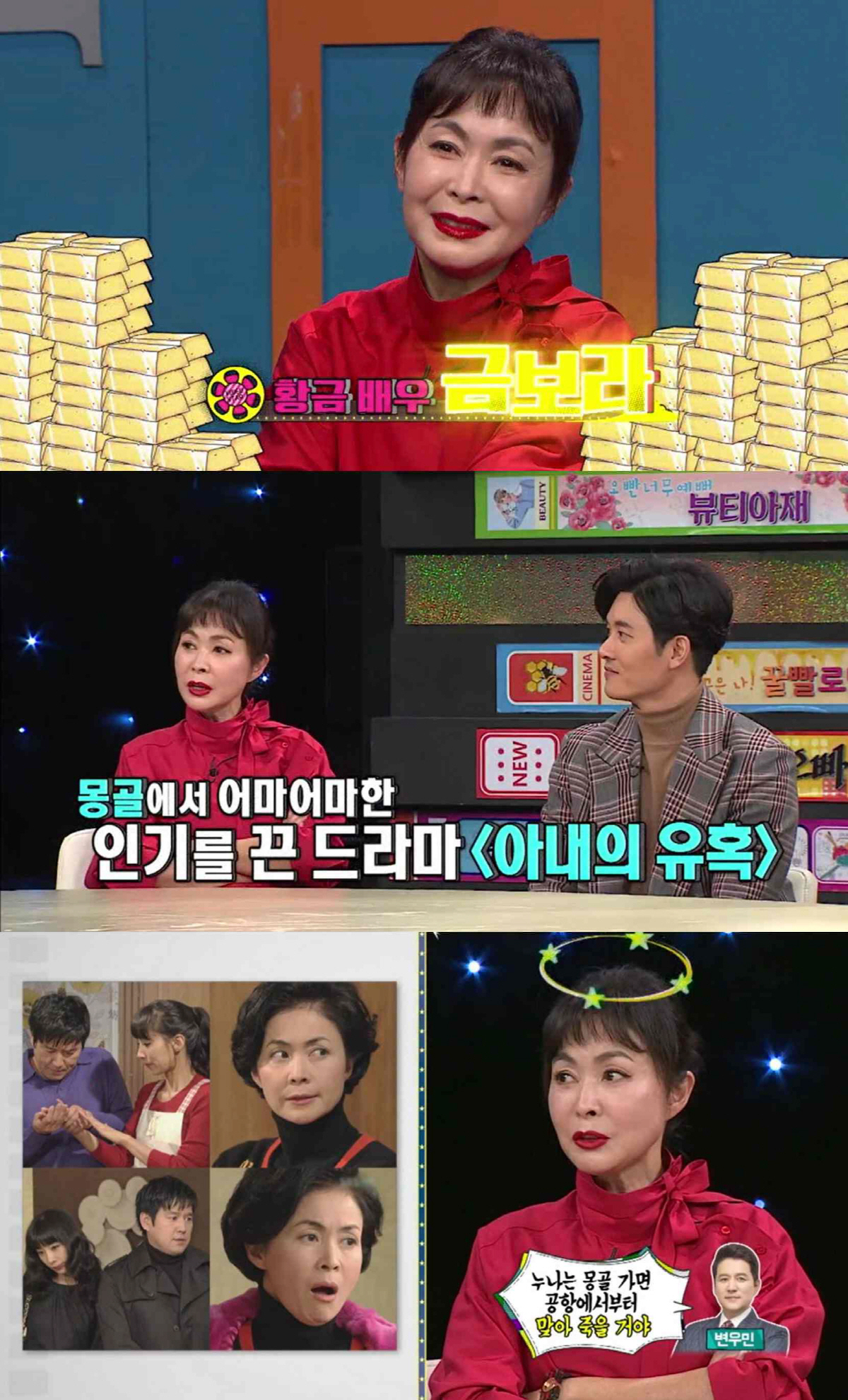 매번 리얼한 연기로 악역마저 완벽히 소화하는 배우 금보라. 그녀는 SBS 드라마 '아내의 유혹'에서 며느리를 괴롭히는 시어머니 역으로 열연해 강렬한 인상을 남겼다. 국내에서도 히트한 '아내의 유혹'은 몽골에서도 80%의 시청률을 보이며 히트한 바 있다. 금보라는 몽골에서 악덕 시어머니로 너무 얼굴이 알려진 바람에 출입이 힘들어졌다고 밝혔는데, 이와 관련 '아내의 유혹' 동료 배우 변우민의 섬뜩한 증언을 전하며 주목 받았다.