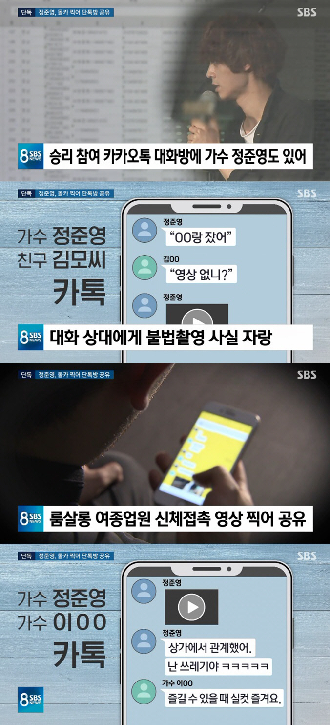11일 방송된 SBS '8뉴스'에서는 빅뱅의 승리가 포함된 카카오톡 채팅방에 속해 있는 정준영이 불법 촬영 영상을 유포했다고 보도했다.
