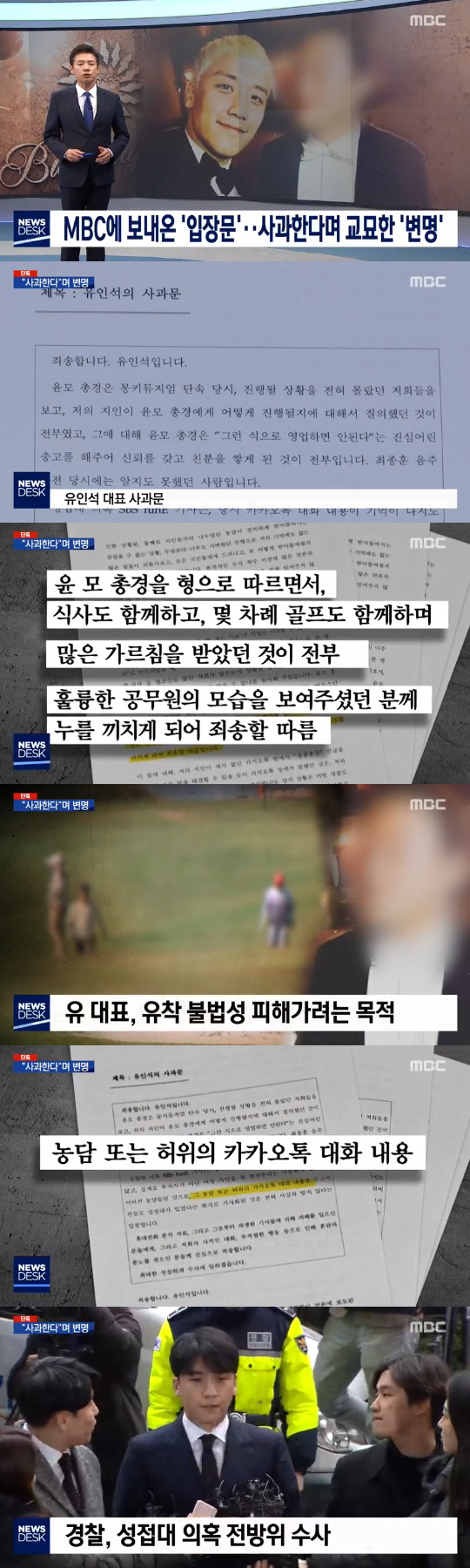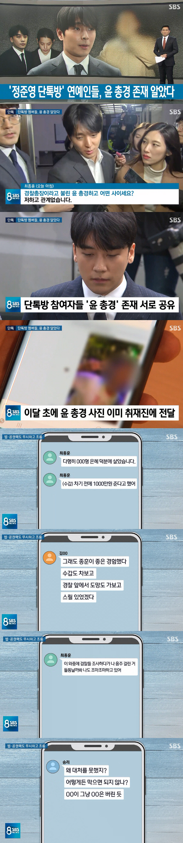경찰 유착 의혹도 갈수록 짙어지고 있다. 승리의 성접대 의혹이 불거진 문제의 카카오톡 단체대화방 멤버들이 '경찰총장'이라 불렀던 윤 총경과의 유착 정황이 드러나고 있기 때문이다. 윤 총경은 해당 대화방 멤버인 FT아일랜드 최종훈의 음주운전 적발사건, 승리와 유인석 씨가 만든 몽키뮤지엄의 식품위생법 위반 적발 사건 등을 무마해 준 의혹을 받고 있다. 또 최종훈의 폭로로 윤총경이 유인석 씨와 승리는 물론 박한별과도 골프회동을 가졌다는 사실이 드러나며 논란은 일파만파 커지고 있다. 유인석씨는 "최종훈 음주운전 사건 당시에는 윤총경을 알지도 못했고 몽키뮤지엄 사건 때는 진행 절차를 물어본 것 뿐"이라고 해명했지만, 경찰은 윤총경에 대해 대기발령 조치를 내리고 유착 의혹에 관한 조사를 진행 중이다. 또 박한별을 참고인 신분으로 불러 유착 관계를 조사할 방침이다.