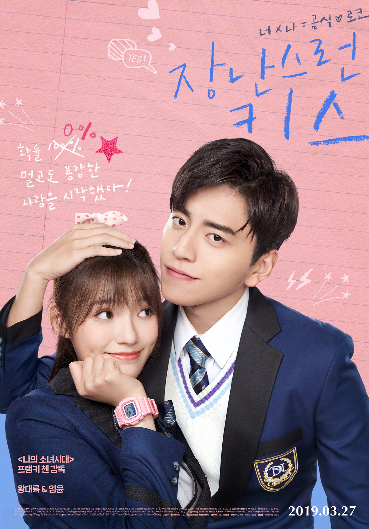올 봄, 극장가에 장난 아닌 장키주의보를 발령, 로코의 새로운 흥행 공식을 쓸 영화 '장난스런 키스'는 A반 남신 '장즈수'와 처음 본 순간 KISS한 F반 '위안샹친'! 수학처럼 안 풀려도 절대 포기할 수 없는 확률 0% 멀고도 용감한 짝사랑 일대기를 담은 2019년 봄, 너 x 나 = 공식 ♡ 로코. 로맨스의 바이블이자 아시아 메가히트 동명 만화를 원작으로 한 '장난스런 키스'는 아시아 전역에 대만 첫사랑 로코 흥행 신드롬을 불러일으킨 '나의 소녀시대'(2016) 프랭키 첸 감독의 차기작으로 기존의 장키 팬들은 물론 로코 마니아들까지 흥분 시키며 일찌감치 스포트라이트를 받았다. 여기에 아시아 공식 첫사랑 왕대륙과 흥행 소녀 임윤이 역대급 장키 커플 케미를 선보여 장난 아닌 로코의 등장을 기대하게 한다. 특히 '장즈수' 역의 왕대륙은 이번 영화에서 얼굴천재, 두뇌천재 머리부터 발끝까지 엘리트 남신으로 완벽 변신하기 위해 수학 공부는 물론 테니스, 카누 운전, 수공예 등 극중 '장즈수'가 잘 하는 것들을 실제로도 빠짐없이 마스터하기 위해 노력했다. 이에 왕대륙은 "100%의 노력으로 '장즈수'를 연기해 관객들을 실망시키지 않을 거예요"라고 전했으며 "'장난스런 키스'는 '나의 소녀시대'보다 훨씬 더 코믹할 거예요"라고 덧붙여 기존의 장키 팬들은 물론, 로코 장르 마니아까지 모두의 마음을 섭렵하며 대한민국을 '장난스런 키스'로 물들일 것을 예고한다.